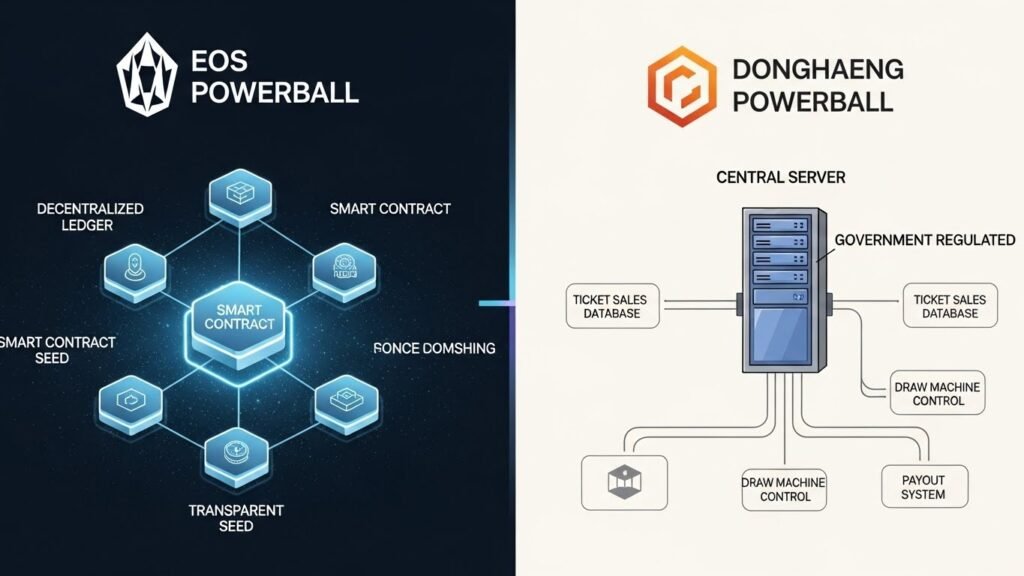 EOS파워볼은 블록해시 기반 RNG로 당첨 번호를 계산하며, 동행파워볼(대한민국 공식 파워볼)은 물리 추첨기·기계式 공 조합을 사용한다. 두 게임은 난수 생성 방식, 당첨 계산 원리, 확률 분포, 변동성 구조가 완전히 다르다. 이 글에서는 두 파워볼의 핵심 기술 차이와 당첨 계산 방식의 구조적 차이를 상세히 분석한다.